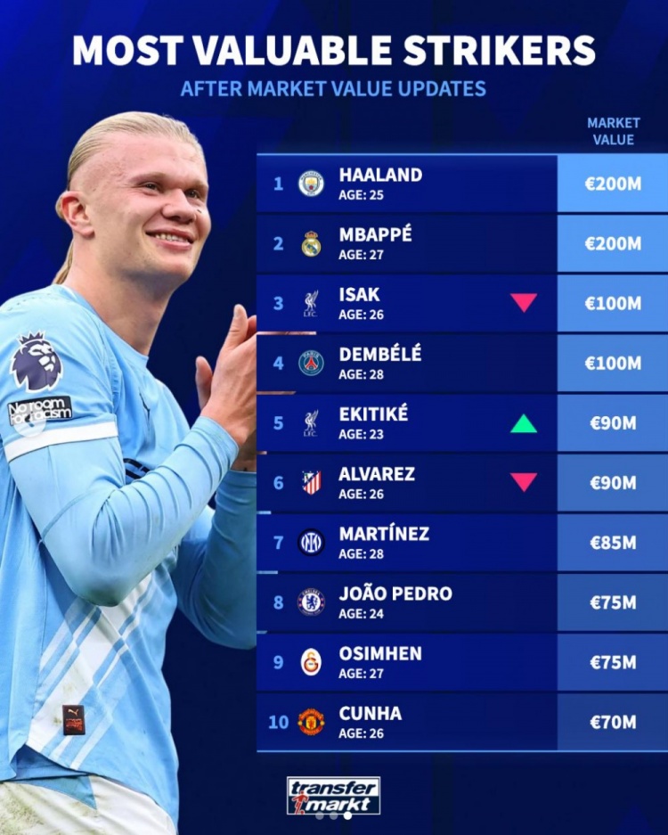 4月13日讯 德转更新了足坛中锋身价情况,哈兰德和姆巴佩均两亿欧,伊萨克、登贝莱均1亿欧紧随其后。